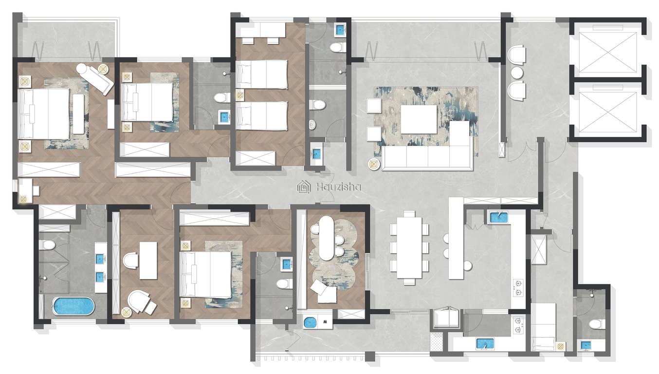 Experience unparalleled luxury and spacious living with our 4B+DSQ residence, spanning an impressive 302m². Step into your exclusive sanctuary via an independent elevator hall that leads to a private lobby, setting the tone for sophistication and privacy. The expansive living area of approximately 38m² features a stunning 6m wide balcony, perfect for relaxation and entertaining guests. Adjacent to the living room is a separate dining room of around 16m², ideal for hosting intimate dinners. The residence boasts both open and closed kitchens, catering to all culinary needs, complemented by a 6.2m long living balcony that enhances the living space with natural light and fresh air. The master suite is a retreat in itself, covering approximately 60m². This luxurious space includes a master bedroom, a private master balcony, a walk-in closet, and a concealed study with a small balcony, perfect for work or quiet contemplation. The ultra-luxurious master bathroom completes this oasis, offering a spa-like experience at home. Each room in the residence is designed with en-suite bathrooms, ensuring privacy and convenience for all residents